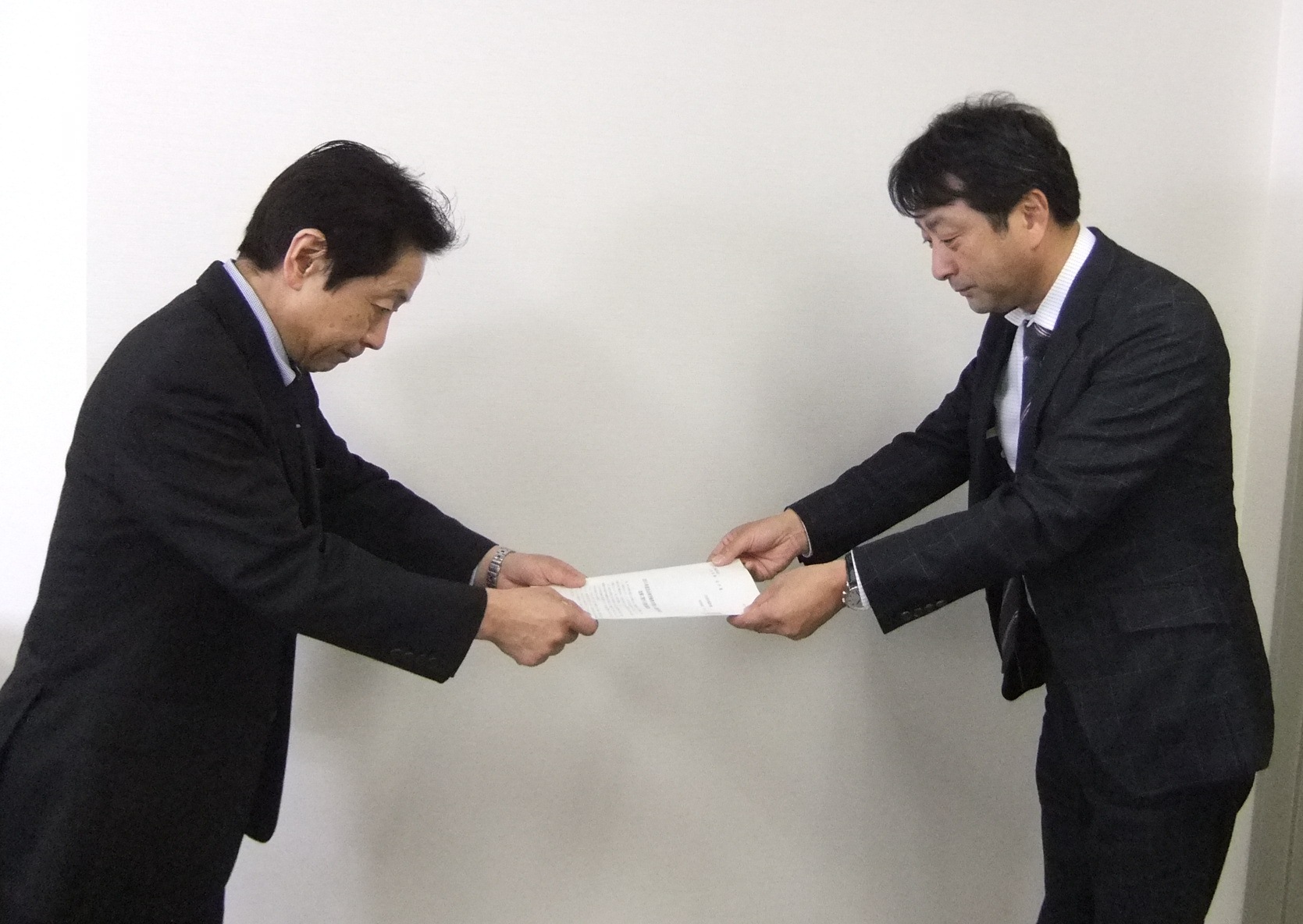 藤盛副執行委員長が、市長会・町村会(それぞれ事務局長対応)へ要求書を手交した後、要求事項の説明を行い、市町村から問い合わせがあった際などの対応をはじめ、市長会・町村会における対応を要請した。