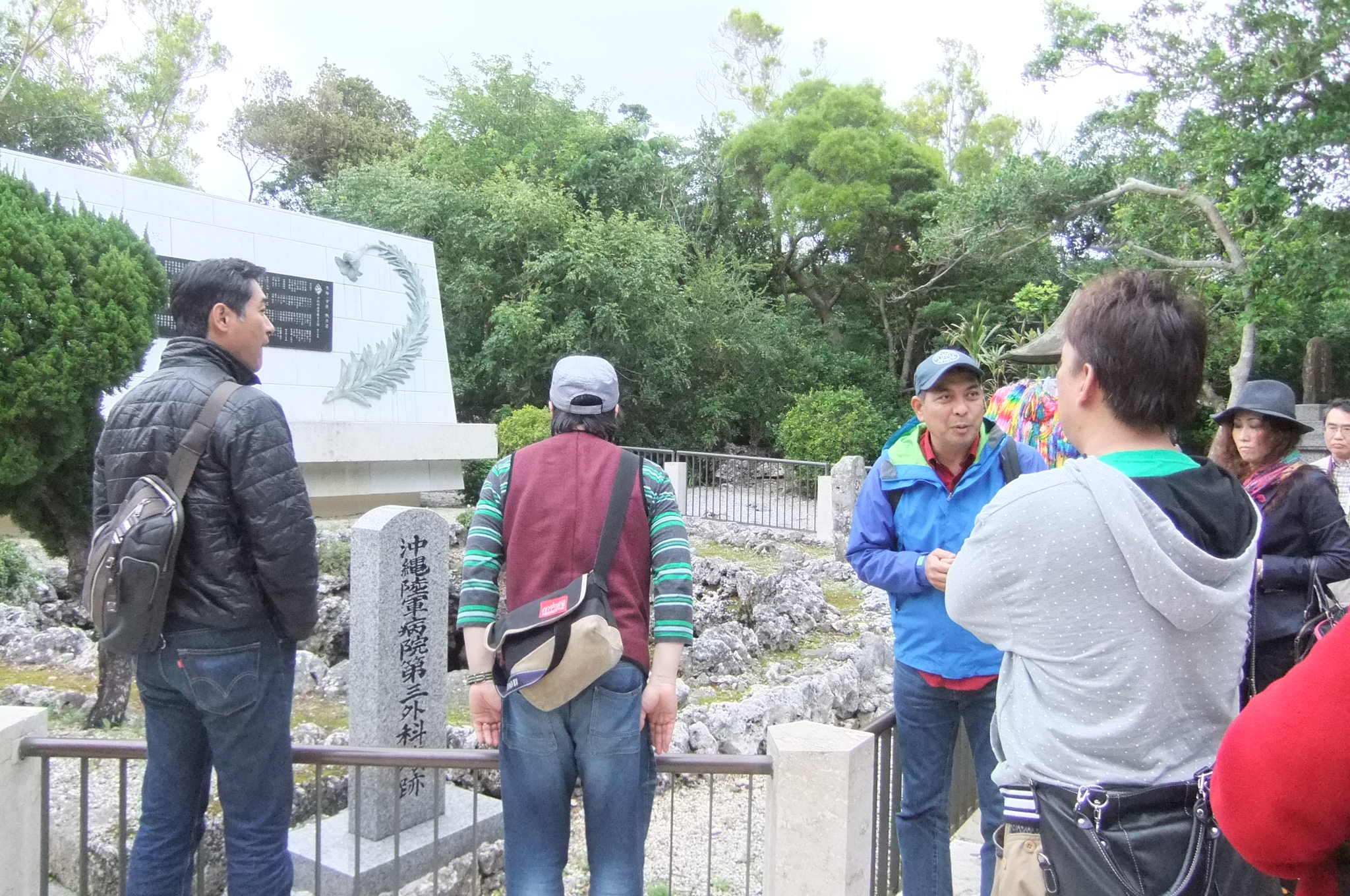 アブチラガマは自然洞窟(ガマ)である。それは第二次大戦時、戦場が南下するとともに避難場所から負傷兵が運ばれる陸軍病院へと用途を変えた。そこには軍医・看護師・ひめゆり学徒隊・慰安婦などが配属され、全長270mのガマを一度で最大1000人が利用したといわれている。ガイドの岸本さんは「“ガマをみて、当時を想像してみてください”という人もいるが、それは難しいことだ。想像を絶する惨状のはず。二度と戦争を繰り返さないよう活動していきましょう」と述べた。