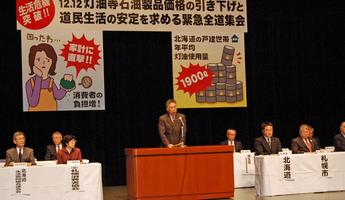 12月12日、札幌消費者協会、連合北海道をはじめとする9団体が共催し『生活危機突破!12.12灯油等石油製品の価格引き下げと道民生活の安定を求める緊急全道集会』が開かれ、会場の札幌共済ホールに約600人が集まった。