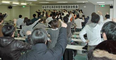 3月1日~2日、札幌市・自治労会館において62単組・総支部100人(うち女性11人)が参加し、道本部青年部政治集会を開催した。