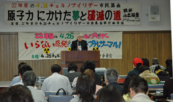 市民実行委員会を代表して住友道平和フォーラム代表は、「チェルノブイリ周辺では600万人が汚染地域で生活している。白血病やガンを発症する人々が後を絶たない。真実を隠し、金で解決してきたツケである。22年目をむかえて脱原発運動の強化が問われる。原子力による被爆汚染を繰り返さないため、平和運動の観点からも泊原発でのプルサーマル計画など国のエネルギー政策の転換を求める運動を強めていく」とあいさつした。