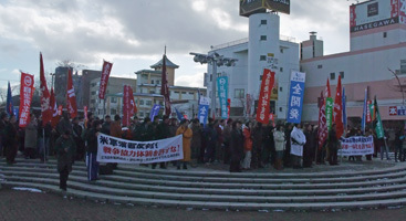 これに反対して、連合北海道などが12月7日、千歳市内で米空軍戦闘機千歳基地訓練移転の白紙撤回を求めて全道集会が開かれ約500人が集まった。
