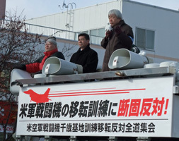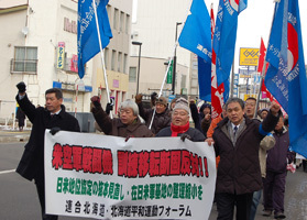 集会では、地元の千歳地区連合、苫小牧地区連合が決意表明し、米空軍戦闘機訓練の千歳基地訓練移転反対決議を採択した。その後、千歳市内をデモ行進して訓練反対をアピールした。