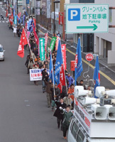 主催者を代表して、連合北海道・住友副会長は、「日本各地で、アメリカの戦闘機が常時使えるように米軍再編し、使用しようとしている。反対運動として、道知事、各市長に即刻撤回の要求してきた」と述べ、「日本は3000億円を米軍再編に使っている。政府は、働く場を失う人が増えている中でやるべきことがある」と指摘した。さらに「米軍にお金を使うことをガマンさせられている。国の政治を変えるため、政権交代しなければならない!」と強く訴えた。