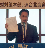 決起集会は、主催者を代表し、連合北海道村田事務局長が『沖縄の実弾演習の国内移転について、「平和と軍縮」を基調とした在日米軍の規模縮小、米軍優先の不平等な「日米地位協定」の抜本見直しなどを国に強く求めてきた。しかし、私たちの声を無視し、「沖縄と同質・同量」との約束を反故にし、昨年まで10回の実弾移転演習を強行してきている。これは、明らかに「固定化」であり、「沖縄の痛みの分かち合い」の美名のもとで、基地の拡大・強化をはかるものである。私たちは、わが国の平和と民主主義、そして道民の生活と安全を守るとともに、全国の中間と連帯し、在日米軍基地の整理・縮小、日米地位協定の抜本的見直しのたたかいをさらに広げていこう』とあいさつがした。