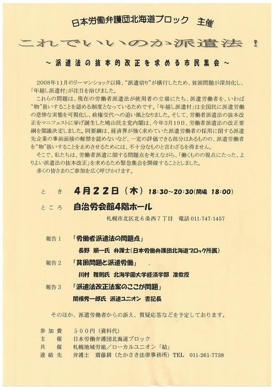 4月22日(木)18時30分から自治労会館で、派遣法の抜本改正を求める市民集会が開かれます。派遣や貧困問題で発信を続ける有識者から熱い報告を聞きます。