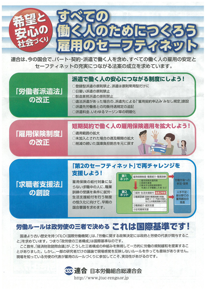 連合は今の国会で、パート・契約・派遣で働く人を含め、すべての働く人の雇用と安定とセーフティネットの充実につながる法案の成立を求めている。
