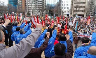 政治課題については、今夏の第22回参議院選挙は、民主党の基盤を安定させる重要なたたかいであるとして、昨年の総選挙から、参議選、統一自治体選を『ホップ・ステップ・ジャンプ』の一連のたたかいと位置づけてたたかう」と強調した。