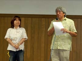 講師には、「辺野古を考える-戦争のない時代を築くために撮る-」と題し、藤本幸久さん(ドキュメンタリー映画監督)と影山あさ子さん(ジャーナリスト・映画プロデューサー)を迎え行われた。二人は、ジュゴンとヤンバルクイナがデザインされたシャツを着て登場した。