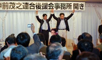 【画像】支援者の拍手に応える、枝野民主党幹事長(右)と中前しげゆき候補予定者