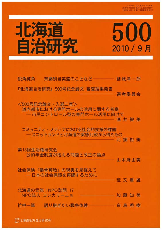 社)北海道地方自治研究所が発行している「北海道自治研究」が500号をむかえました。