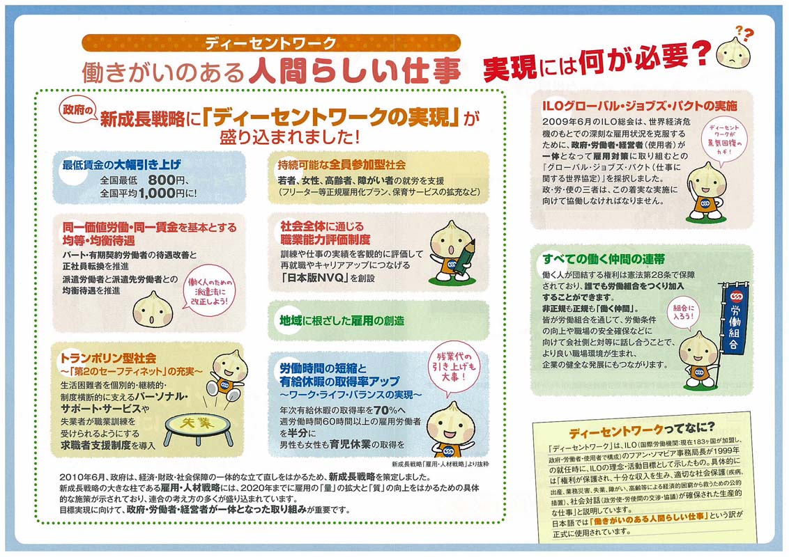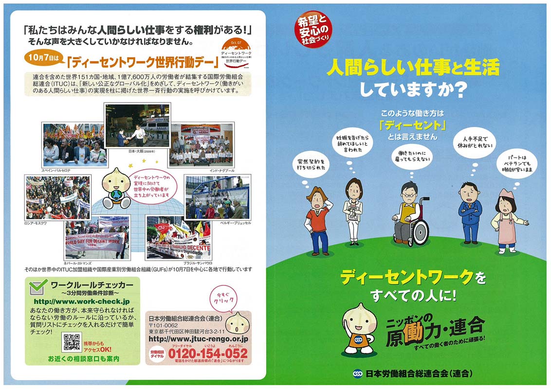 連合が加盟する国際労働組合総連合(ITUC )は、一昨年、毎年10月7日を「ディーセントワーク・(働きがいのある人間らしい仕事)世界行動デー」に設定しています。