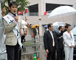 中前茂之さんは、雨の中集まった多くの支援者に感謝の言葉を述べた上で「今、北海道の地域経済は、これまでの政治政策により疲弊した。立候補にあたり、大きく3つの政策をかかげている。1つは、雇用の問題。高校を卒業しても職につくことができない現状。そのためにも、新規採用する企業への、支援や融資をし、新しい雇用の場を確保したい。2つ目は、くらしの安全。安心して子どもを生み育て、安心して老後をむかえる社会づくり。今までの政権では、自己責任とされてきた。安心、安全の社会をめざす。3つ目は、北海道らしい地域主権づくり。半年は雪の中でのくらしと厳しい環境にあります。1次産業を大切に、北海道の食の品質・安全を伸ばしていきたい」と強調し、「それには、政権の安定が必要。政権を安定させるのか、不安定にさせるのか。この北海道を誰が責任を持ち、誰が守るかをしっかり考えてほしい」と述べ、「I LOVE 北海道、どさんこの中前茂之をよろしくお願いします」と力強く訴えた。