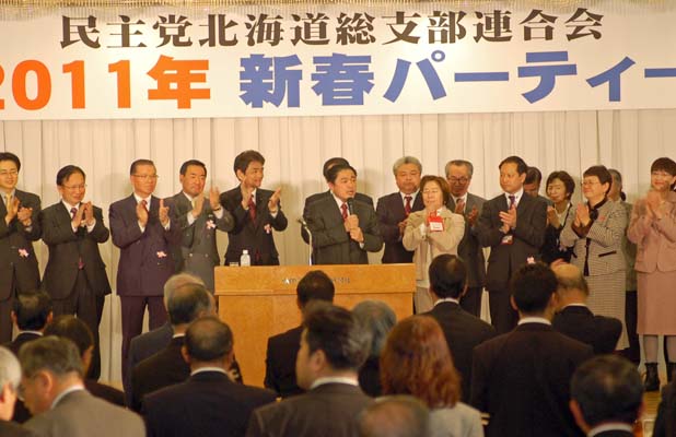 1月21日、札幌市内のホテルで民主党北海道のパーティーが開かれ、自治労道本部が推薦する、木村としあき知事候補予定者や、統一自治体緒選挙でたたかう自治体議員候補者らが出席し、代表して、木村としあきさんがあいさつした。