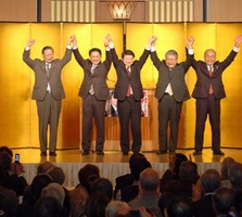 左から、竹内實後援会長、木村としあき知事候補予定者、片山善博総務大臣、上田札幌市長、鹿児島県鹿屋市やねだん公民館長の豊重哲郎さん