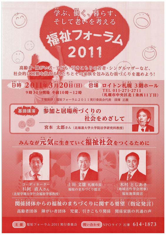 3月20日(日)10時から、ロイトン札幌3Fホールで福祉フォーラム2011が開かれます。