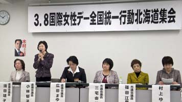 山田連合北海道女性委員会委員長からあいさつを兼ねて、3・8国際女性デーの起源、目的について話した後、4月に札幌市議選に出馬を表明している村上ゆうこ民主党中央区副代表から決意を込めたあいさつした。