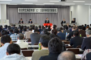 道本部は、本日1月11日13時から札幌市・北海道自治労会館で「2013国民春闘討論集会」を開き、約250人が参加した。