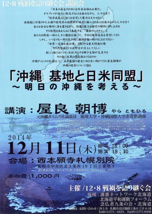 12・8戦禍を語り継ぐ会(後援:護憲ネットワーク、北海道平和運動フォーラム)は12月11日、12・8戦禍を語り継ぐ講演会「沖縄基地と日米同盟~明日の沖縄を考える」を開きます。
