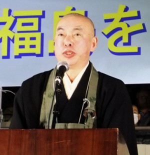 開会のあいさつで、呼びかけ人の僧侶 吉岡棟憲(とうけん)さんは「福島原発事故により家庭という小さな平和さえも奪われた。しかし、国、東京電力は真剣に謝罪していない。絶対に許すことはできない。美しい福島を取り戻したいとの思いが、日本中、世界中に響き渡るよう願う。」と述べ、最後に「福島の浜通り・中通り(いずれも福島の原発地域)=もとどおり」と思いを比ゆし、言葉にした。