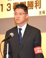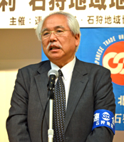 はじめに、主催者を代表し、井上・連合北海道石狩地域協議会会長が「日本はおかしな方向にむいている。株価が上がっても私たち労働者の賃金は上がらない。アベノミクスは、弱肉強食の社会にしようとしている。非常に危険な状況だ。今春闘は正念場のたたかい。参院選をはじめ政治闘争の強化が必要。今集会で春闘をたたかう意志統一をしよう」と述べあいさつした。