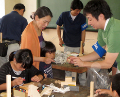例年好評の木工細工教室では、学校を修繕する際に出される木片を有効利用し、子どもたちが創意工夫のなかで工作を体験することができた。職員から、のこぎりなど道具の使い方や、アドバイスでそれぞれが作品を完成させた。